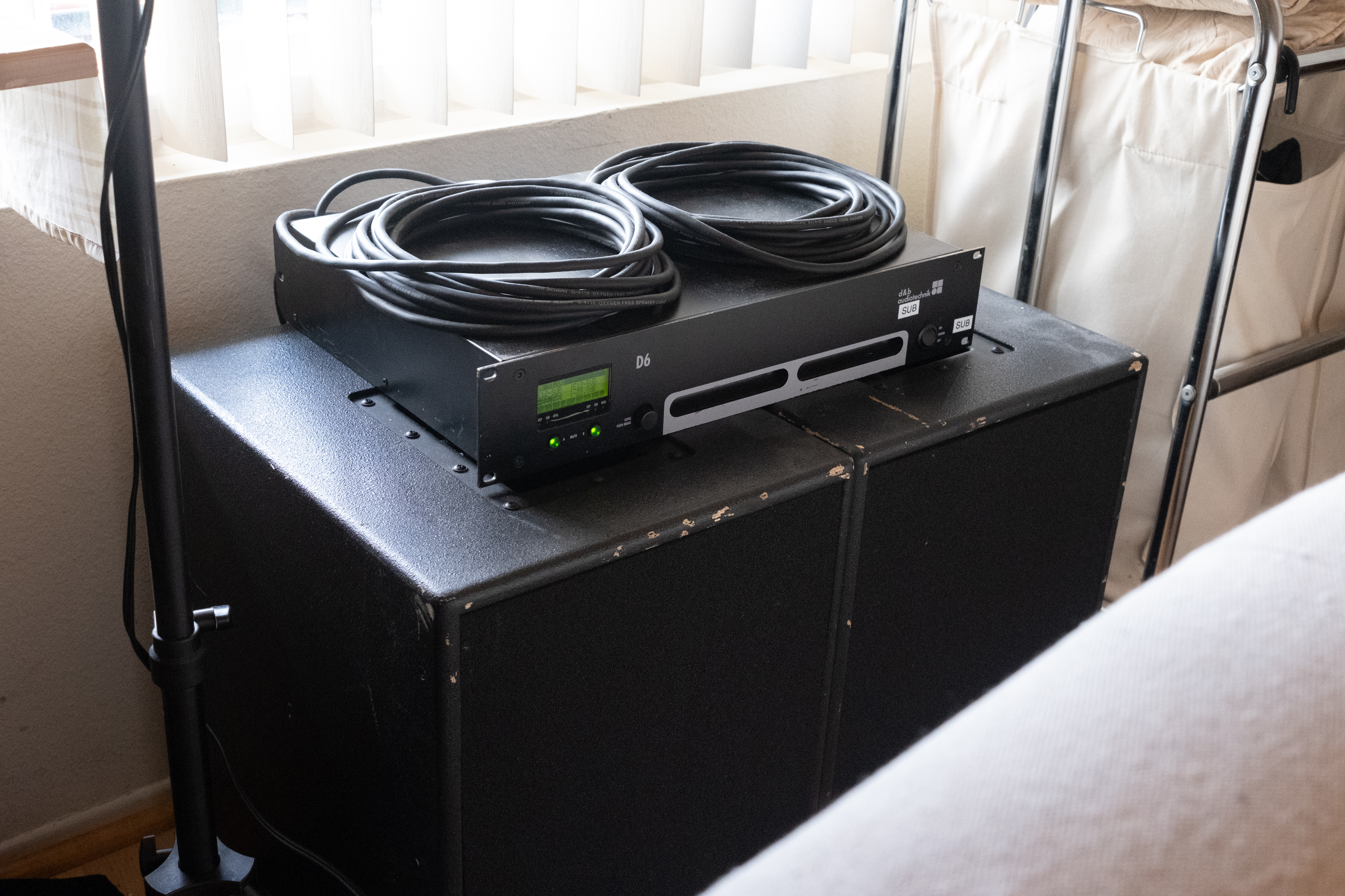 I had a couple couches lined up one behind the other. The 2.1 setup sounded quite nice from the front, but the rear seats had noticeably less low end, probably due to a room node. To slightly reinforce the low end for the rear seats, I pulled out my d&b subs against the rear wall. These speakers are meant more for live sound, so they excel at output more than a flat response. I had them running very low and out of phase with the front sub – this seemed to do the trick in boosting the 50-80Hz range.